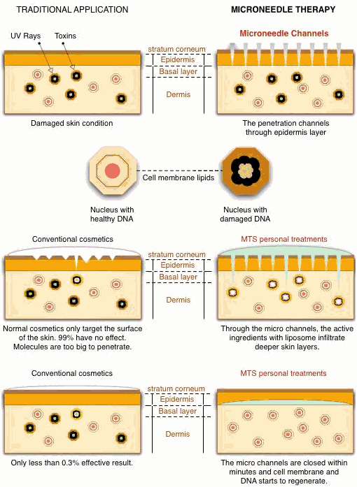 Dermarolling remolds the skin by creating thousands of microscopic channels through the skin, increasing the formation of new tissue by activating the body's wound healing cascade (hemostasis-inflammation-proliferation-tissue remodeling). The micro-channeling causes the release of growth factors that promote scar-less healing and the deposition of normal woven collagen rather than scar collagen. The fibroblasts are responsible for collagen production. The exact mechanism how this happens is complex and not yet completely understood. New collagen and elastin forms. In one study, twenty blinded biopsies taken from 10 different patients from various parts of their body demonstrated an average increase in new fibers of 206%, in one biopsy a 1000% increase was recorded.